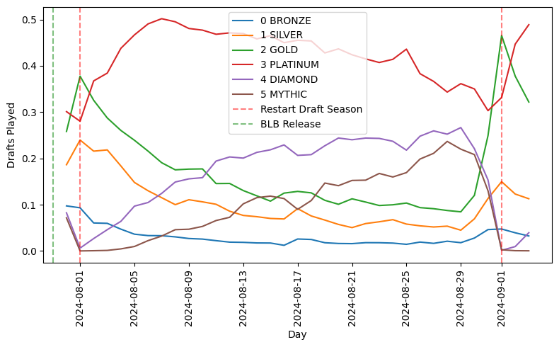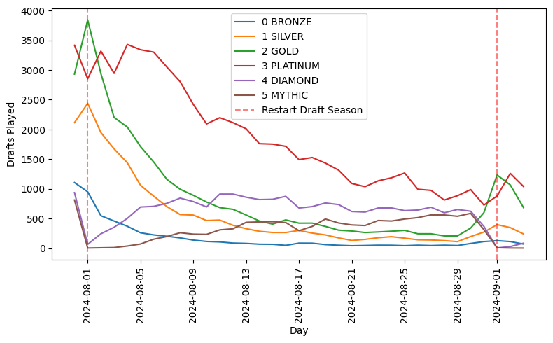 Starting on 08-01, we observe distinct patterns: Gold rapidly declines after an initial peak of 3,800 drafts per day. Platinum peaks during days 4-6 before dropping. Diamond shows a slower climb with a plateau between days 8-13, followed by a gradual decline. Mythic starts at zero and slowly climbs, reaching a peak of 500 drafts per day around days 13-16.