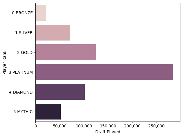 To assess player skill, I plotted the number of wins by player rank. While I don’t have player IDs to track individual performance, this view provides an average performance snapshot of the player base. Additionally, since I cannot track the number of drafts per player, more frequent players will be over-represented in the data.