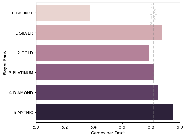 Figure 4 shows the number of games played per draft for each rank. We see that more advanced players typically have longer games.