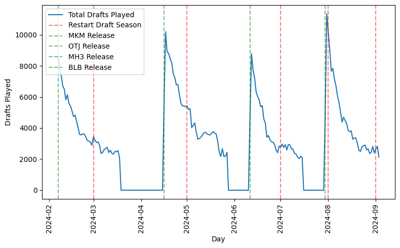 In Figure 6, we see the number of drafts played over time across multiple sets. Note that where data is missing, the values are imputed as zeros.