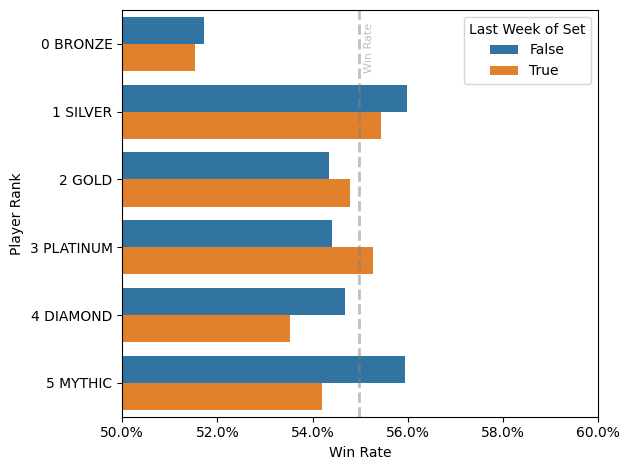 To account for players getting used to new sets, I plotted the win rate for the last week of set play compared to the earlier timeframes. In Figure 3, we see a decline in win rates for higher ranks. This pattern suggests that higher ranks may become more competitive as the season progresses, while lower ranks tend to become more casual.