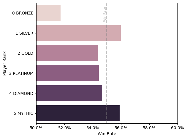 In Figure 2, we observe that win rates vary by rank, with higher ranks generally achieving higher win rates. The Bronze rank has by far the lowest win rate, reflecting new or less skilled players. Interestingly, the Silver rank shows the highest win rate, likely due to the influx of Gold and Platinum players who reset to Silver at the start of the season and quickly climb back up the ranks.