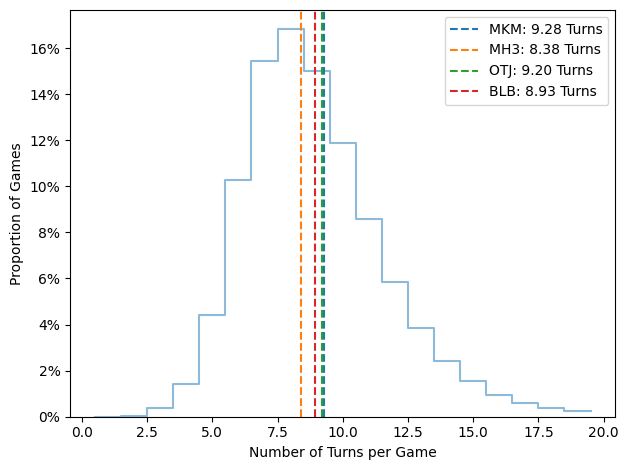 The MH3 set has the fastest play by far, with an average 8.4 turns per game. The other sets are around 9 turns per game on average.