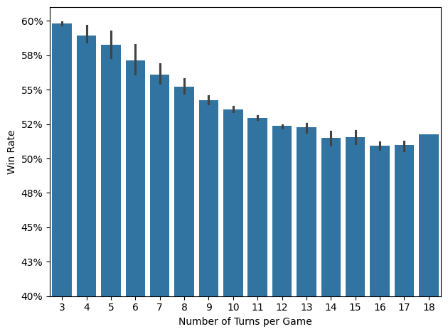 I’m also interested in how 17Lands players perform relative to the number of turns. In Figure 2, we observe that players are more likely to win games that end quickly. The win rate is 55-60% for games that conclude in fewer than 8 turns, dropping to 50-55% for games that last longer. The faster games may have a higher mix of decks that have a strong early game, or players who are better at closing out games quickly.