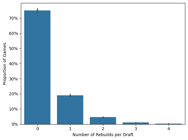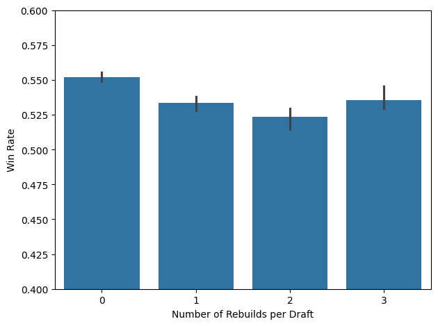 In Figure 2, we observe the relationship between win rate and the number of rebuilds. Decks with more rebuilds tend to have lower win rates, but it’s unclear whether players are rebuilding more to salvage a poorly drafted deck or if rebuilding itself is a suboptimal strategy.